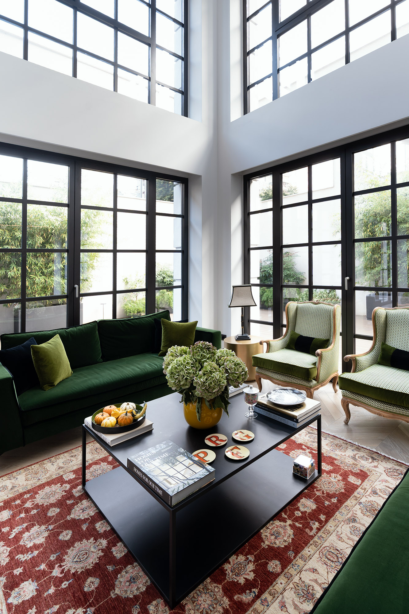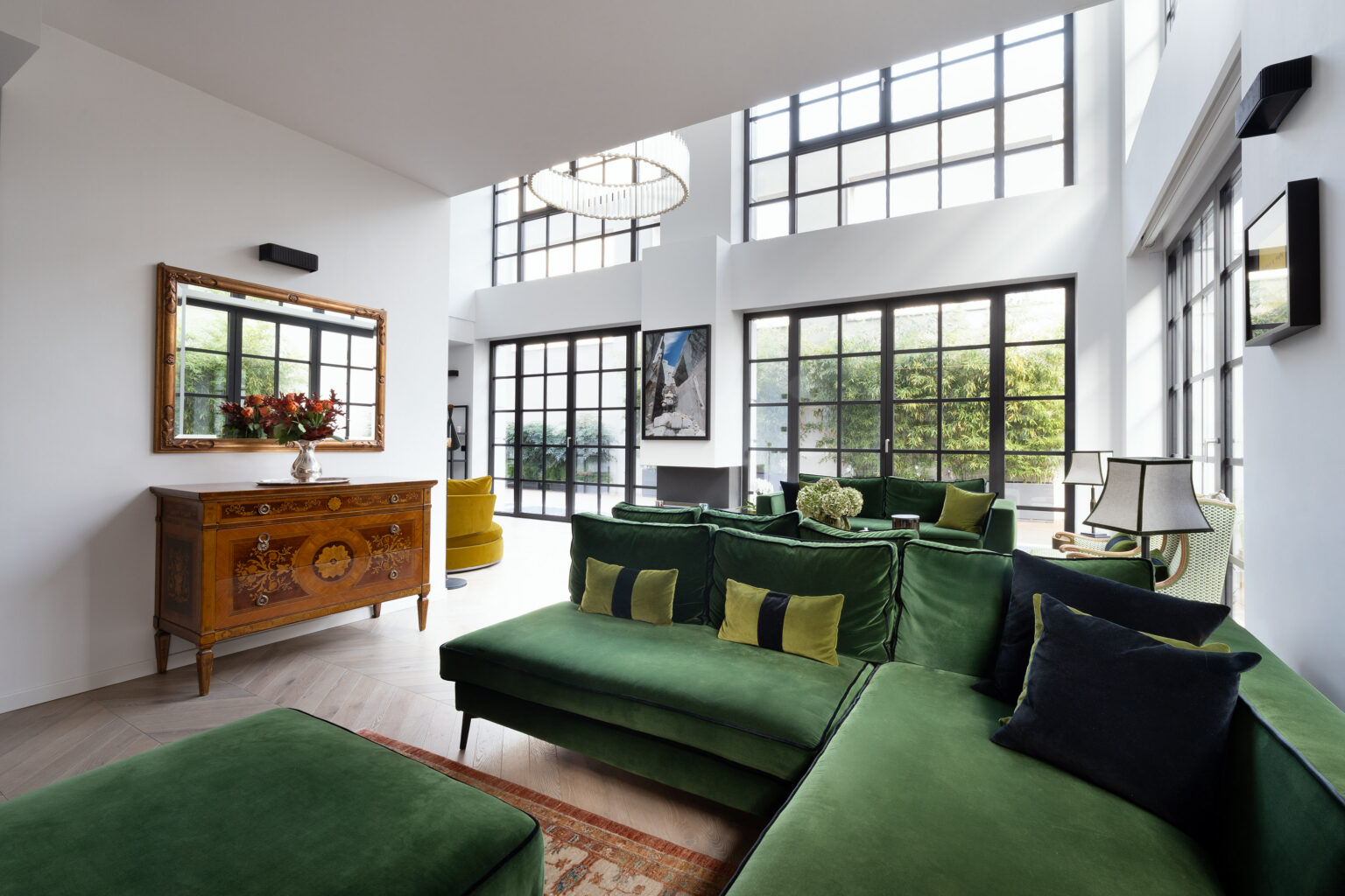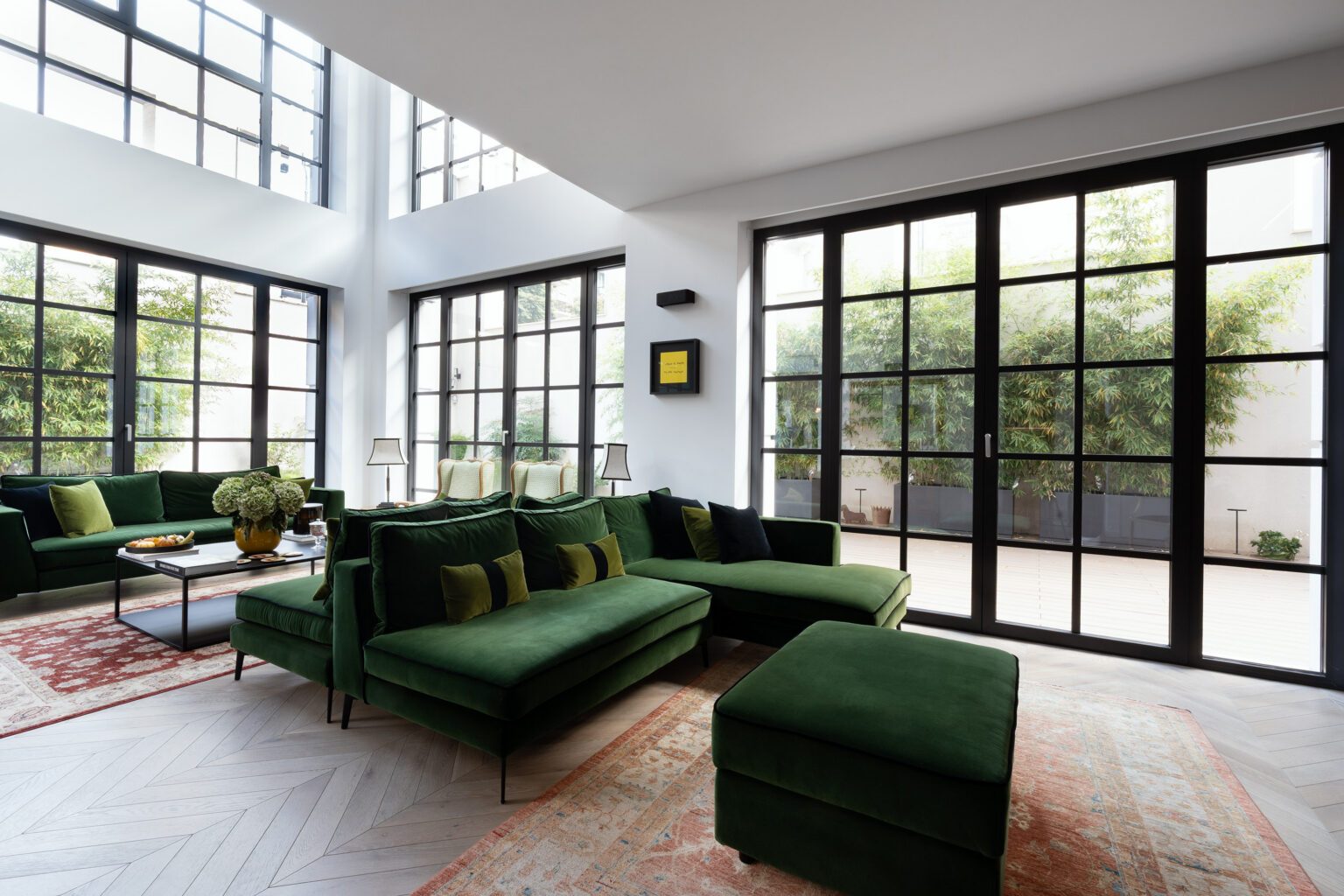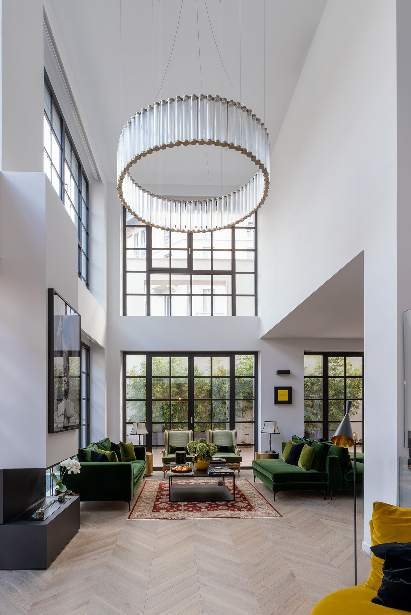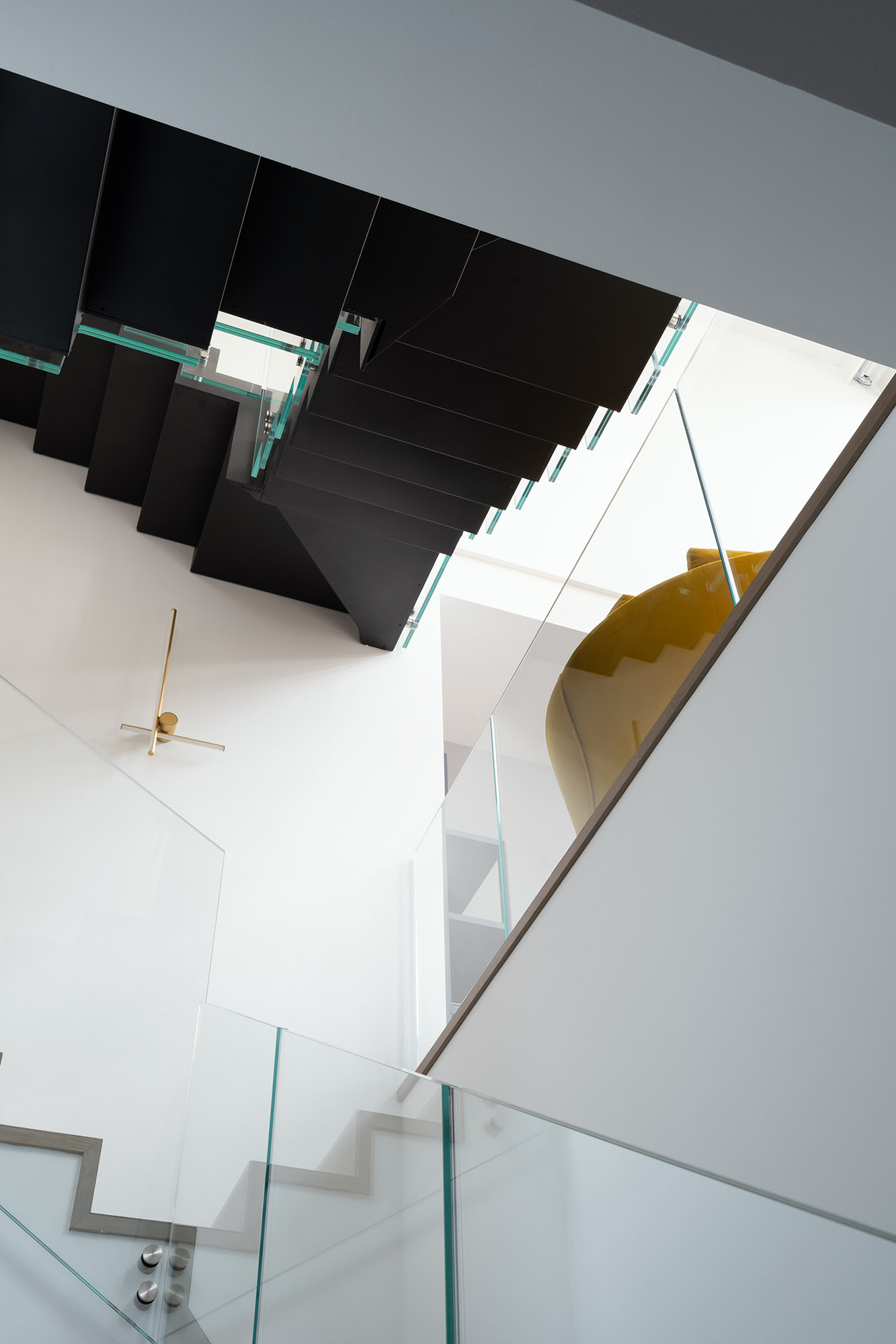 Punto centrale della villa urbana disposta su 3 livelli è l’ampia zona living con una doppia altezza di 6 metri. Ferro, legno e il verde giardino privato sono i tre elementi attorno cui ruota tutto il moodboard del progetto. Tutti gli arredi sono stati progettati su misura.