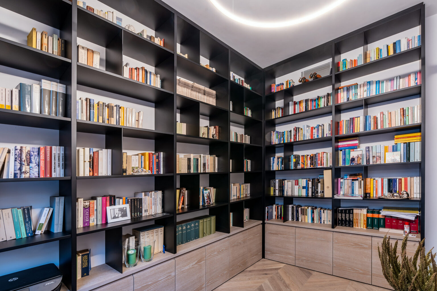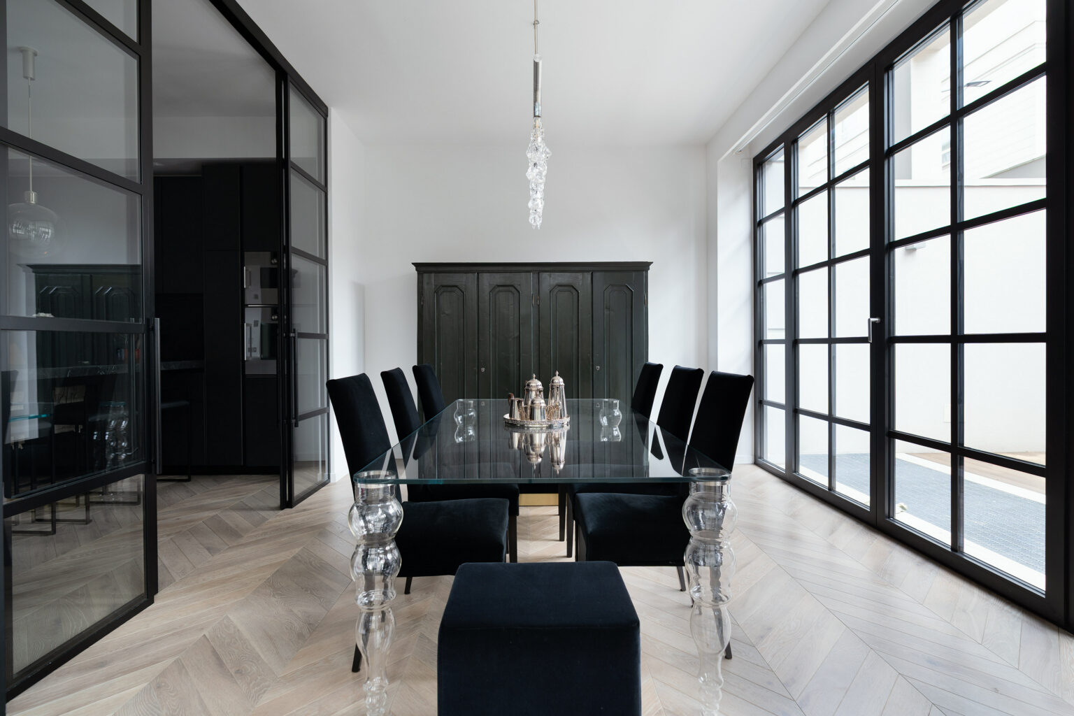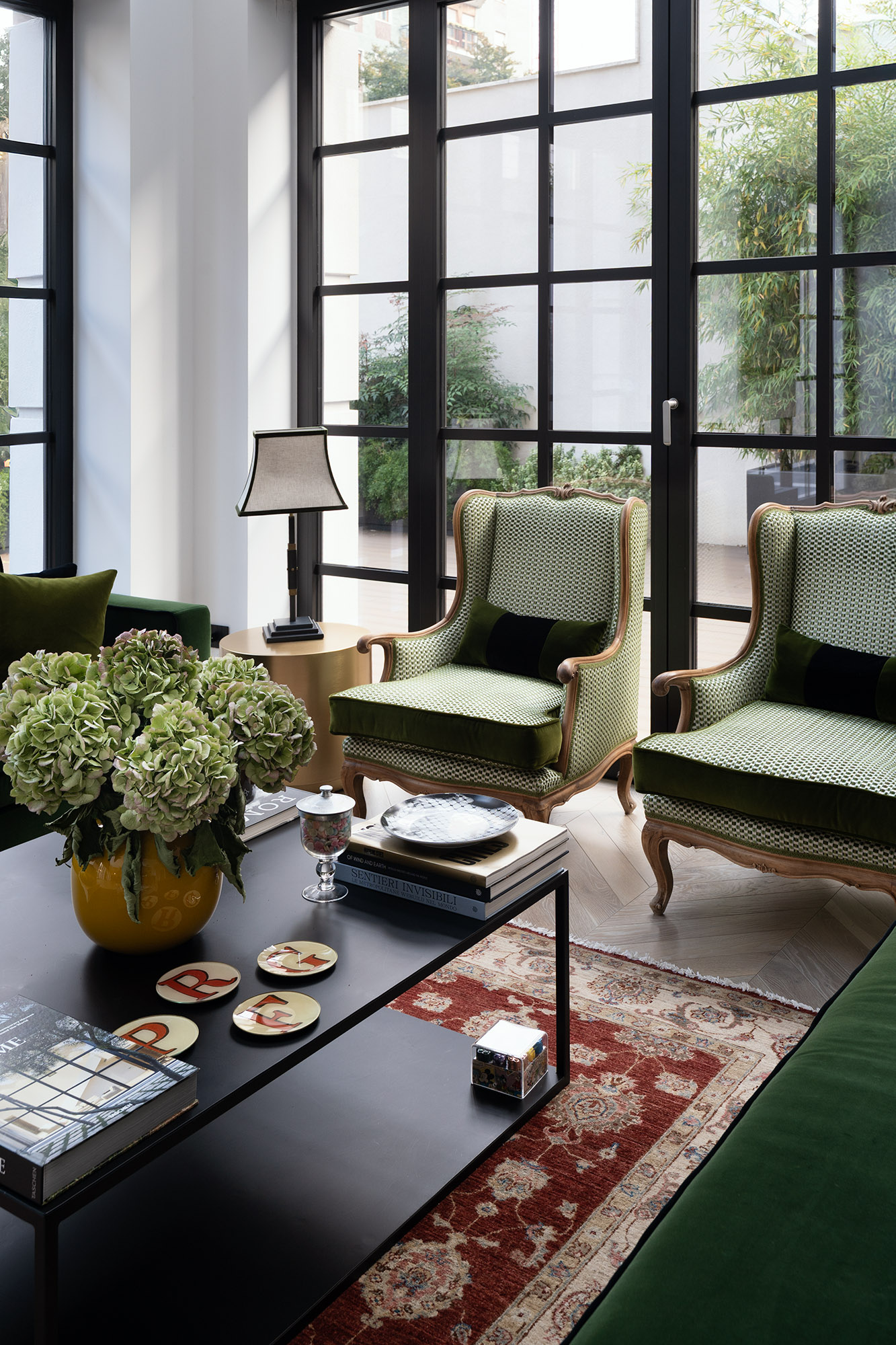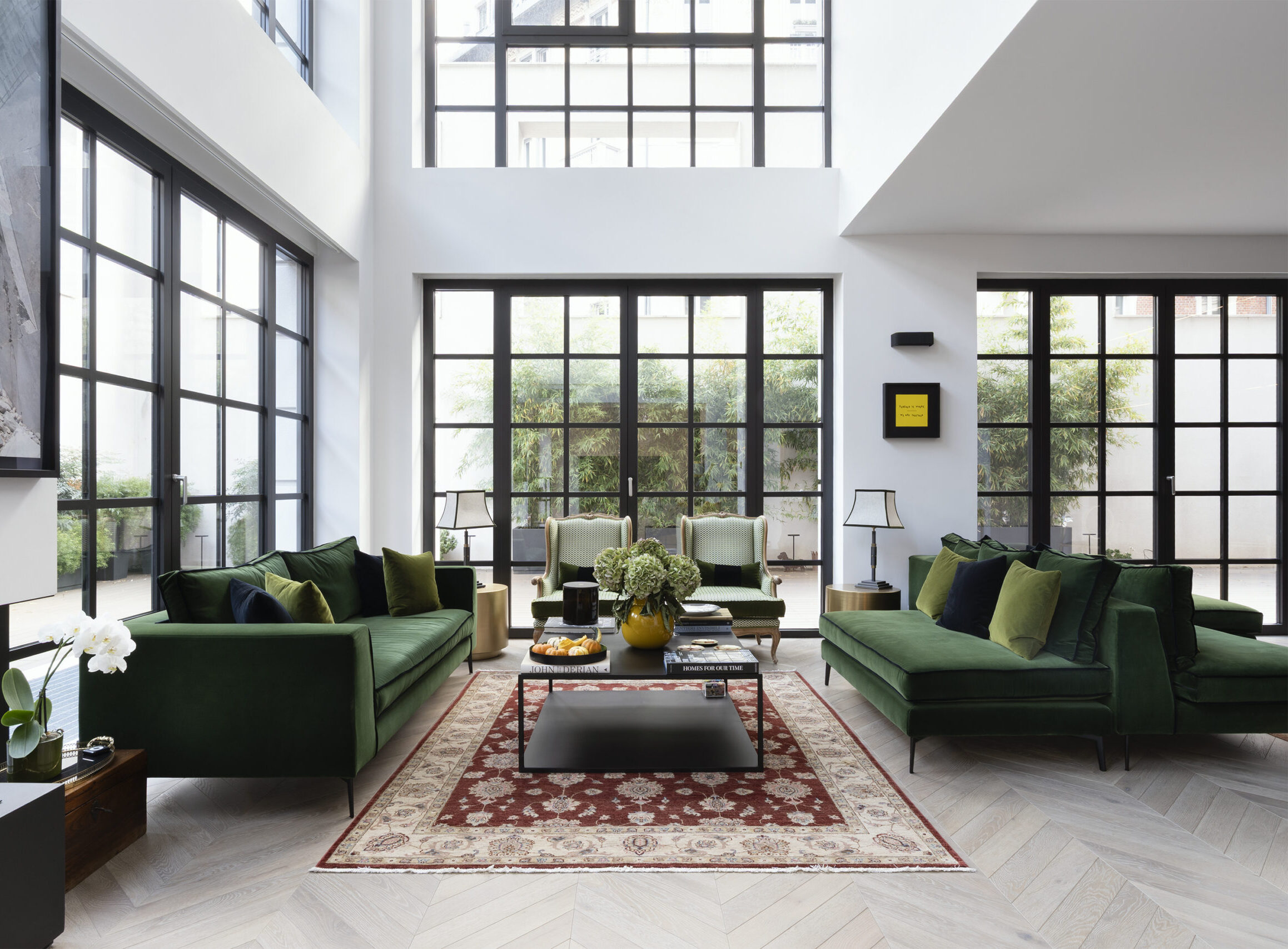 Punto centrale della villa urbana disposta su 3 livelli è l’ampia zona living con una doppia altezza di 6 metri. Ferro, legno e il verde giardino privato sono i tre elementi attorno cui ruota tutto il moodboard del progetto. Tutti gli arredi sono stati progettati su misura.